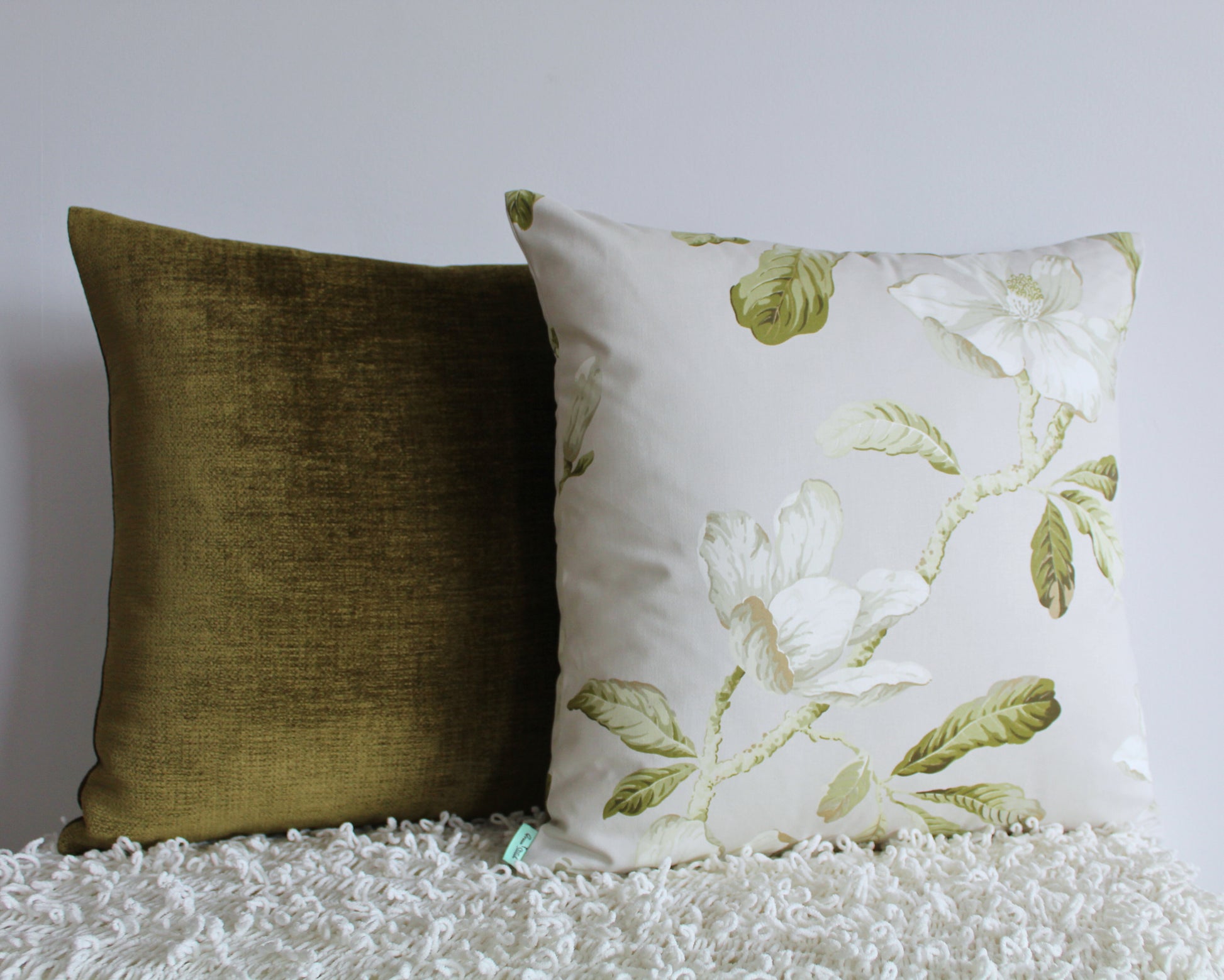 The delicate floral print adds softness and interest, while the deep olive velvet grounds the look, creating a warm and inviting combination that works effortlessly in both classic and modern interiors. Perfect for sofas, armchairs, or bedrooms, the Amelia Bloom Set brings a relaxed, garden-inspired feel indoors.