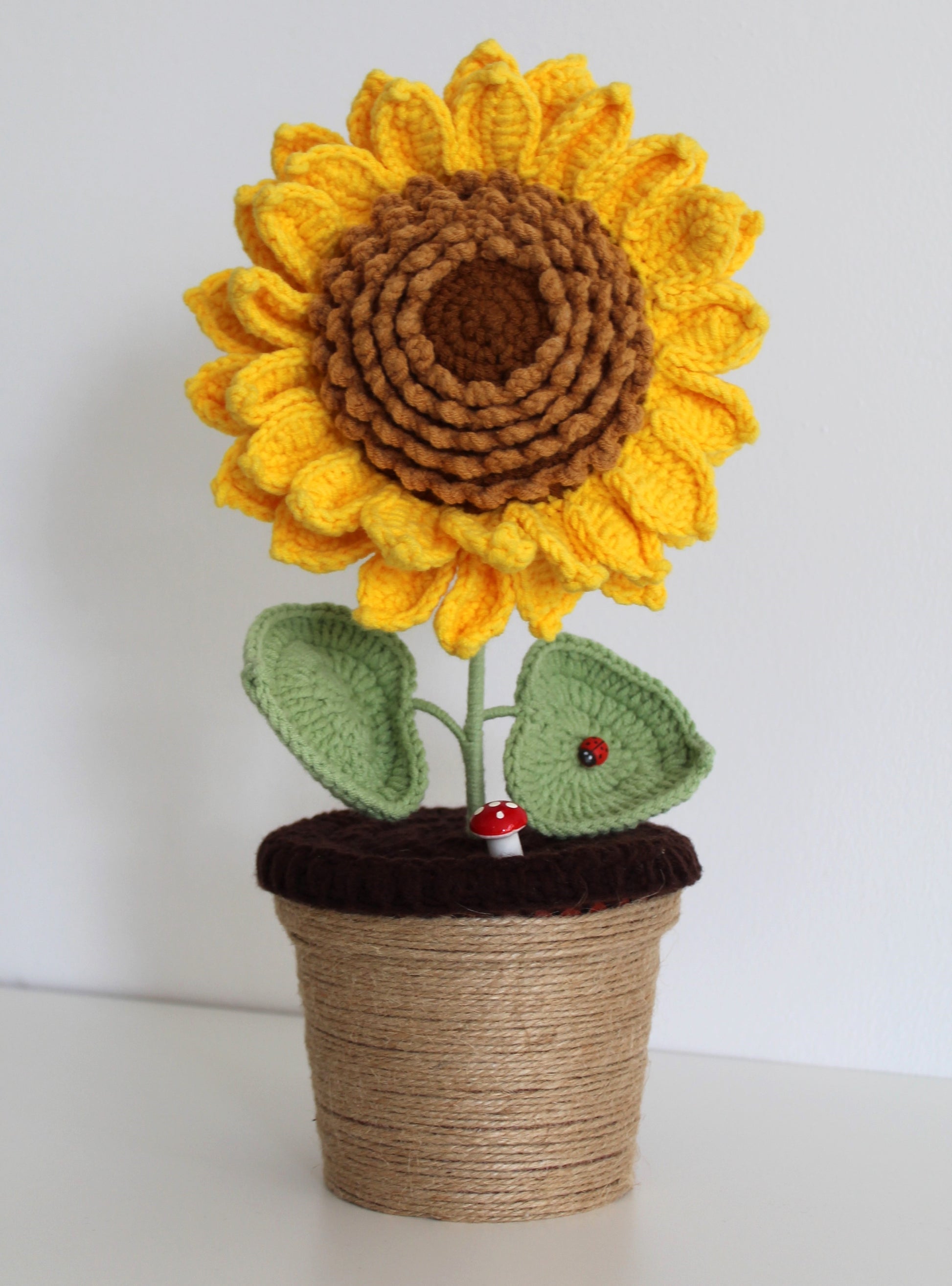 Brighten any space with our handmade crochet Golden Sunshine sunflower. Crafted from soft wool in vibrant yellow and earthy brown, this forever bloom adds a touch of cheer to your décor — no watering required. Perfect for desks, shelves, or gifting a little sunshine to someone special.