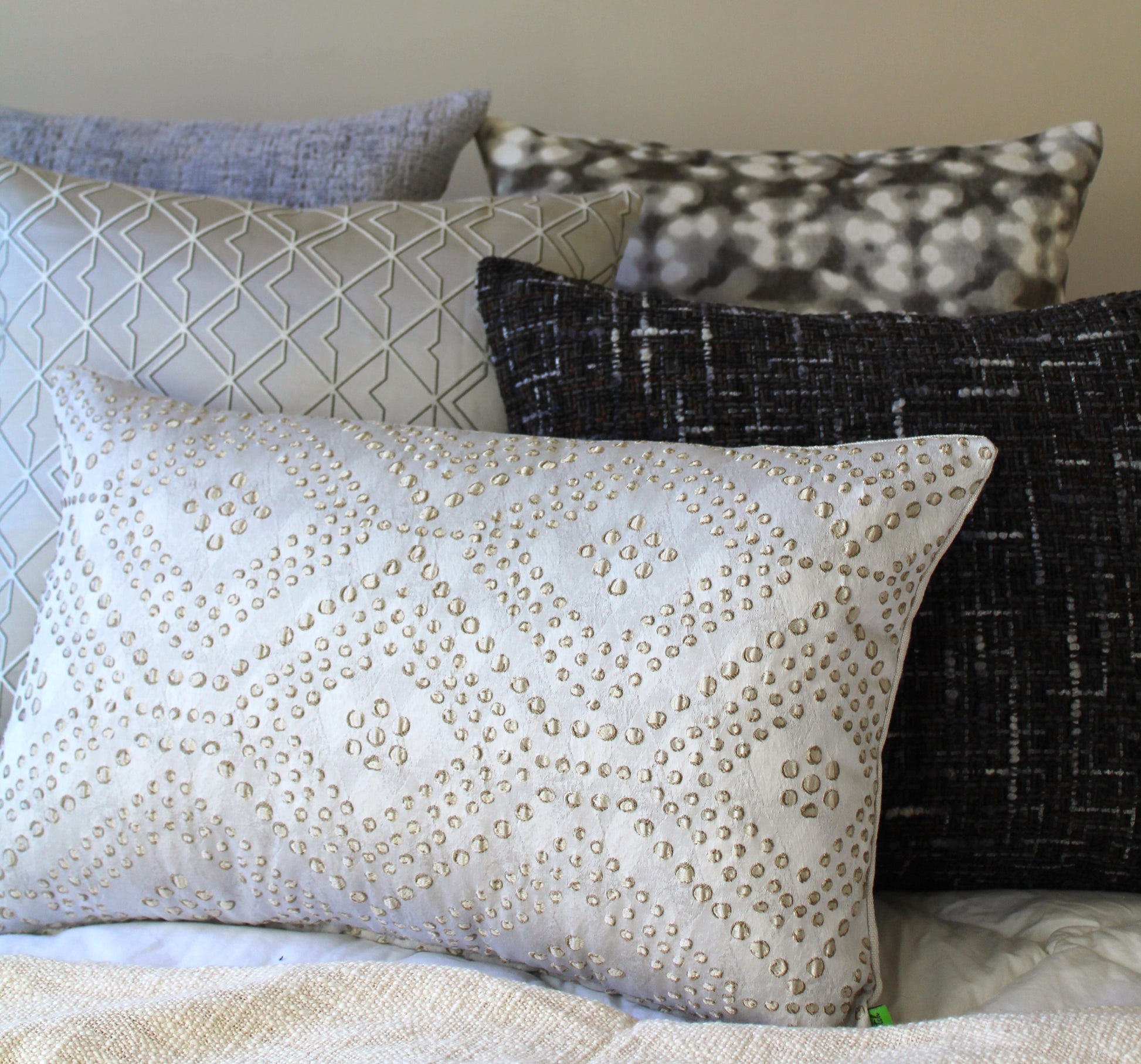 This full cushion set from the Silver Lining palette brings together calming neutrals, textured fabrics, and delicate detailing to create a look that’s both serene and sophisticated. From velvet geometrics to plush teddy textures and rich earth tones, each piece adds depth and quiet beauty to your space.